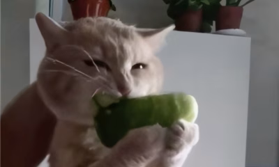 In russia vegan woman introduced her cat to eat cucumber and cats ate.