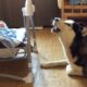 A Dog, holding a stick in its jaws found itself trapped in garden but finally managed to get through.