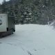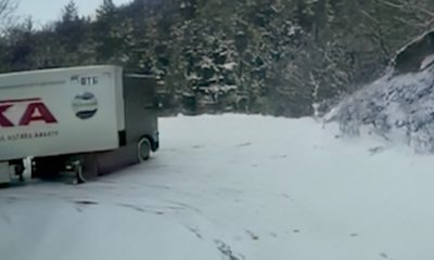 A long-distance driver lost control of their truck on a snowy road after skidding on a bend.