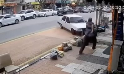Man nearly gets hit by a tumbling car in a busy location. Miraculously, a pedestrian was not hit by an overturning car in a busy street....