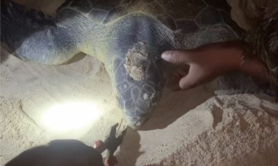 The shore team spotted a turtle caught on a hook on the beach and could save it by carefully cutting it free.