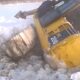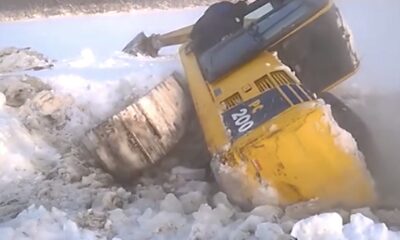 Unable to get out of an icy creek, the excavator incorrectly maneuvered into an icy creek