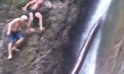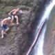 The man who wants to climb the water-licked waterfall to show off to his friends