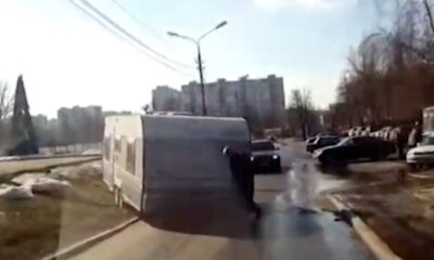 The trailer towed by the truck broke off the tow bar and crashed into the vehicle behind it.