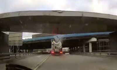 The height limiting beam fell on the car at the intersection In the video shows touching a concrete mixer coming from the front. Driver and passengers...