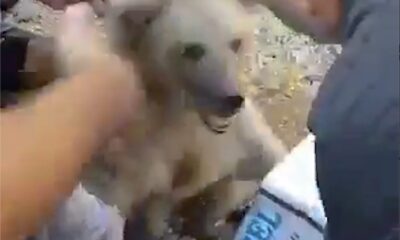 The baby bear, which was stuck in the tree as a blind knot with iron wires, was rescued by knocking out