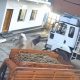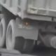 The truck is missing a wheel, but it is still moving