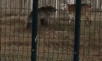 The hungry bear, who went down to the city, tried to eat the goat by entering the park with greenery.