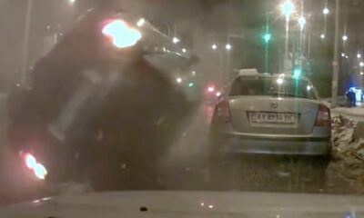 A car blew up, flipped, and crashed after hitting a loose manhole cover.