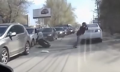 A distracted motorcyclist crashed into a vehicle, then fled, leading to a wild veer off the road while being chased.