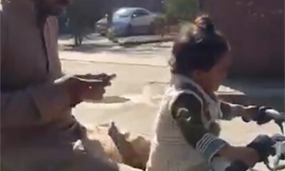 Dumb dad who goes to the field in the morning leaves control of the motorcycle to his daughter and looks at Facebook likes