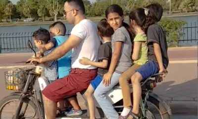 Taking his entire family on a scooter, the father and children amble and ride without a helmet.