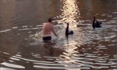 swans place the man who enters the artificial lake to cool off, swans throw out