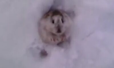 The little snow mouse that came out of the snow seeing the fishermen gets angry with the fishermen