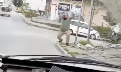 The turquoise-fronted Amazon parrot was filmed looking into the lens on the busy highway