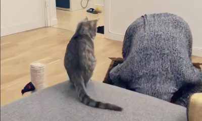The feline leaped onto the lady while she was praying.