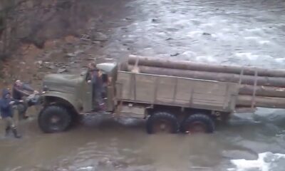 Trucks hauling timber from mountainous forest areas are crossing rivers without bridges to carry them