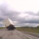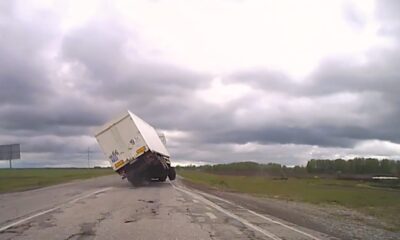 The crane hanging on the moving truck on the highway hit the truck trailer