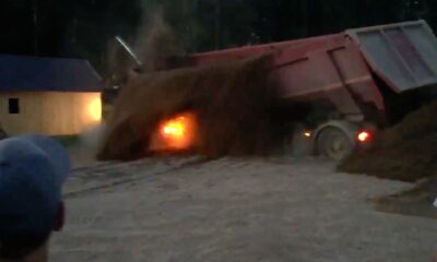 While the dump truck was completely unloading, it failed and the tipper body fell.