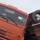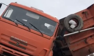 Loaded dump truck nearly flips over on rough terrain, accidentally unloading its cargo