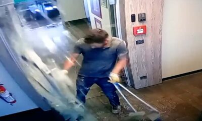 While the hardworking housekeeper opened the glass door for cleaning, the door crumbled and only the door handle remained.