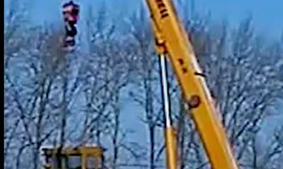 When the crane operator, unloading a heavy load, set the vehicle platform unstable, the crane turned upside down
