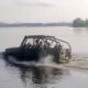 Senior off-road people who were doing off-road in a shallow lake stuck their vehicle in slime