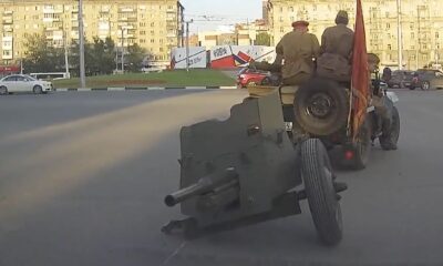 While the comrades were going to parade with the cannon cart from World War II, the wheel came off.