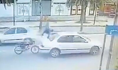 The motorcyclist, who crashed into the braking vehicle on the road, rolled over and climbed onto the vehicle he crashed into.