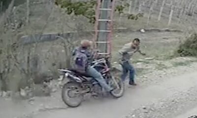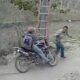 Charismatic man falling off motorcycle hugs a citizen right after accident