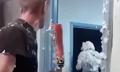 The guy making glass balconies is trying out the glass windows by giving them a good hit.
