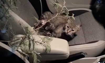 A woman discovered a charming mother cat and her kittens in her car after leaving the window open overnight.