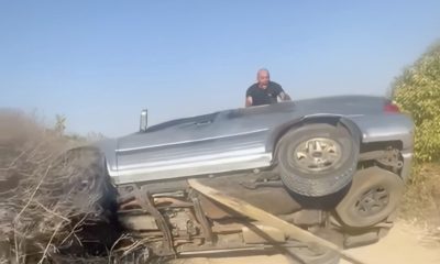 A man tumbles off the roof of a salvaged vehicle while enjoying a beer beside a flipped car.