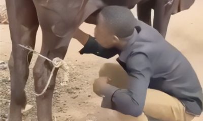 The shepherd fed with curd cheese welcomes the drink from a live cow