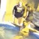 The dude got worn out and sat on a cardboard box, then quickly exited when it gave way.