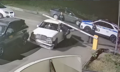 Cops cornered suspects at a garage door, but the suspects forced the door open—escaping with an officer still holding on. The police car got stuck in...