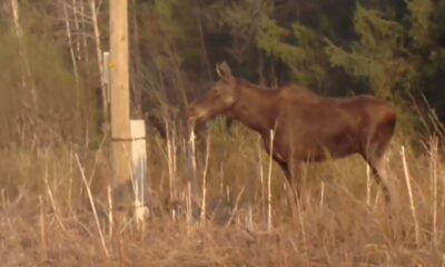 Father Elk helped the baby elk cross the road safely when he got stuck on the road