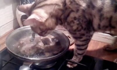 The family, who made fun of the cat at home, tied a sausage to the cat and measured its reaction.