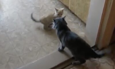 While the cute kitten and the neighbor cat were fighting, the other neighbor cat intervened and prevented the fight.