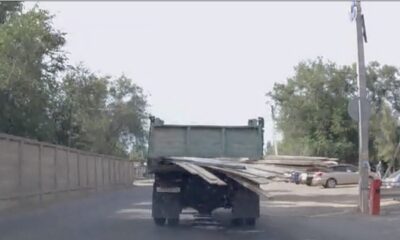 Irresponsible dump truck driver drives cyclist off the road after recklessly handling his load