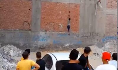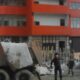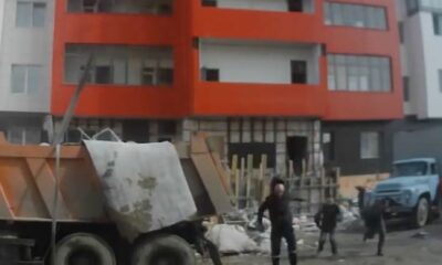Workers going out with a crane in the construction, ignoring the safety rules