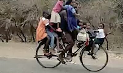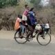 Nothing is impossible. Head of the family returning home from his land with his family all ride a family bike