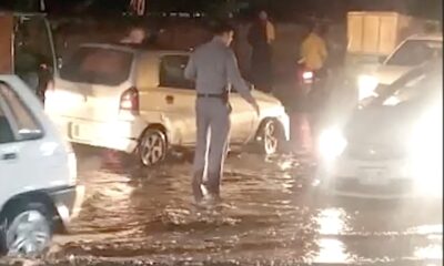 The police managing the traffic is doing his job without complaining rain or storm and he is doing with love and passion