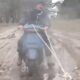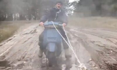 The man whose scooter broke down on the road wants to get it pulled by riding on it.