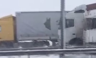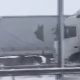 On a snowy highway, trucks without functioning brakes collided with each other.