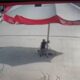 One of the marketers, trying to stop the umbrella caught in the wind, flew away with it.