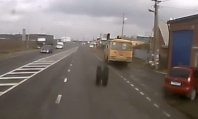 A truck’s tire flew off, smashing into another car.