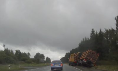 Heavy with trees, the trailer toppled over as the truck malfunctioned and turned over.