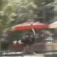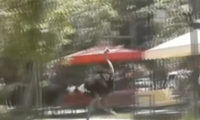 The ostrich running away from the ostrich farm chased the red-haired girl for tea in the park near