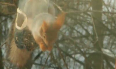 The squirrel who entered the bird feeder was held hostage in the manger, it is thought to have entered there because it starved.